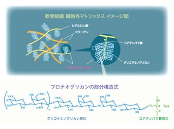 プロテオグリカンに含まれる多数のグリコサミノグリカン群はスポンジのように水を柔軟に保持しながら、弾性や衝撃への耐性といった機能を担っています。