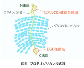 プロテオグリカンの模式図を見て下さい。真ん中緑色の線がコアタンパク質。その一番下にEGF様領域があります。 プロテオグリカンのコアタンパク質にはEGF様領域が存在していますが、サケ鼻軟骨由来プロテオグリカンにEGF様作用のあることが、弘前大学のヒト線維芽細胞を用いた研究により確認されています。