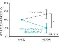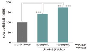 ヒアルロン酸は皮膚において多量の水分を含み、細胞やコラーゲン、エラスチン等の皮膚組織の骨組みのすき間を埋めて、表皮のみずみずしさ、真皮のしなやかさに重要な働きをしています。しかし、ヒアルロン酸の分解速度は非常に速く、老化により産生量が減り、急に存在量が減少し、皮膚のみずみずしさやしなやかさの低下へとつながります。プロテオグリカンは、ヒアルロン酸の産生を促すことが確認されています。 ヒト正常真皮線維芽細胞を用いた、プロテオグリカンのヒアルロン酸産生促進作用の試験では、プロテオグリカンの添加量に応じて、ヒアルロン酸量が有意に増加しています。