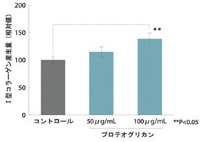 コラーゲンは真皮の7割を占める主要な構造体(マトリックス)で、皮膚の健康を維持するために重要な働きをします。 真皮のコラーゲンのほとんどはⅠ型コラーゲンで、老化などによりコラーゲンの合成能力が低下すると、皮膚のハリが低下し、シワやタルミにつながります。 プロテオグリカンはこのⅠ型コラーゲンの産生を、容量依存的に促進します。