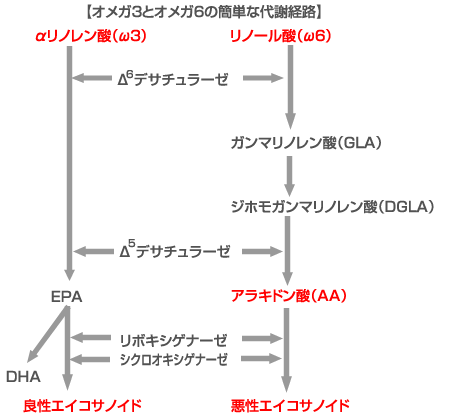 しかし月見草にはオメガー6系列の不飽和脂肪酸であるリノール酸から代謝されてできてくるガンマリノレン酸が多く含まれています。そして、そこからアラキドン酸ができてきますので、むしろアレルギー疾患には禁忌とさえいえます。脂肪酸の代謝図を見てください。