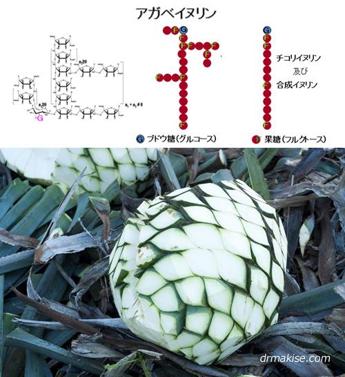 一般には、ダリア、タンポポ、ゴボウ、チコリ、アザミなど、キク科の植物にイヌリンが多く含まれているといわれていますが、リュウゼツラン(キジカクシ科)のブルーアガベにも多く含まれており、 しかも、チコリイヌリンなどと違って高分子のイヌリンで、特有の分岐鎖構造を持っています。そのためアガベイヌリンは非常に水に溶けやすい(100gの水に300gも溶けます)水溶性食物繊維として認められています。そのため、アガベイヌリンだけを錠剤にしたサプリメントもあるくらいです。