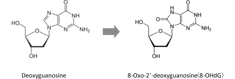 過剰にできた活性酸素によって、細胞内のDNAが酸化されると、酸化したDNAの一部は8-OHdGという別の物質になります。省略せずに書くと、8-hydroxy-2′-deoxyguanosineで、DNAを構成する塩基の一つdeoxyguanosine(dG)デオキシグアノシンがヒドロキシル化されたもので、DNA酸化損傷マーカーです。