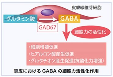 そのGABAはグルタミン酸からグルタミン酸脱炭酸酵素(GAD)によって生産されます。GADには、GAD65とGAD67の2種類あり、後者は真皮の線維芽細胞に存在し、加齢によりGADは減少し、皮膚の老化にもつながります。