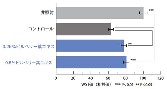 下図は、組織培養用ウシ胎児血清にヒト線維芽細胞を播種して、48時間インキュベートし、その間、ブルーライト(400ナノメートルと450ナノメートル)を400回スキャンし、ビルベリー葉エキスを添加した結果です。有意に保護作用が認められます。