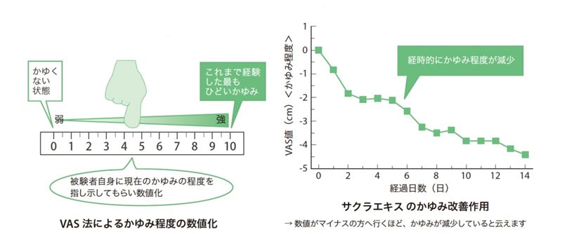 かゆみを有する10から50代の男女5人 を被験者としました。桜エキスを1日1回または2回、痒みを感じる部位に2週間連続塗布し、10分前と塗布開始より毎日、かゆみの程度を10センチメートルスケールのVAS法で数値価された結果です。