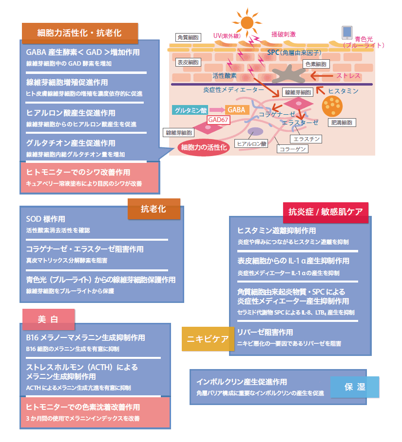 GABA(γ-アミノ酪酸:Gamma-Amino Butyric Acid )は脳中枢神経系において、神経の興奮を抑制する制御性神経伝達物質としてよく知られています。発芽玄米やギャバロン茶などにも多く含まれており、精神安定化作用、脳神経機能の調節、不眠改善の効果などがうたわれています。従来、体内ではGABAは神経組織のみに存在するとされていましたが、真皮の線維芽細胞においても非常に重要な役割を果たしていることがわかってきたのです。そこで、ヒアルロン酸やグルタチオンの産生をGABAが促していたのです。