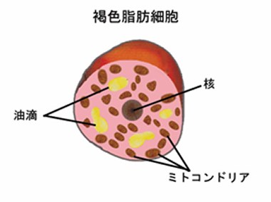 後者は文字通り褐色をしており、量は少なく、出生時には総量150gほどあるのですが、徐々に減少してゆき、思春期までに、40g~50gになってしまいます。大きさも小さく、直径は白色脂肪細胞のそれの10分の1です。また、数も白色脂肪細胞の0.5%~1%です。白色脂肪細胞は体全体に存在するのですが、褐色脂肪細胞は首筋や肩甲骨の周辺などに限られています。太っても、白色脂肪細胞のように数が増えることはありません。ミトコンドリアをたくさん細胞質に有しており、エネルギー生産に重要な働きを行い、体温の維持にも必須です。白色脂肪細胞は脂肪をため込み、褐色脂肪細胞は脂肪を燃焼させるのです。ちなみに、動物の冬眠時の、運動に伴わない熱は、褐色脂肪細胞でつくられます。