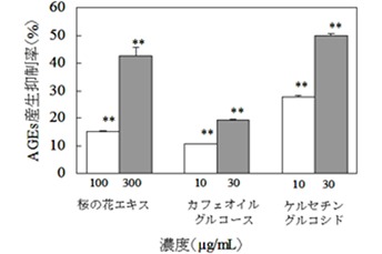 サクラの花エキスは、この厄介なAGEsの産生抑制物質を含有しているのです。それは、カフェオイルグルコース(1-caffeoyl-O-β-D-glucopyranoside)とケルセチングルコシド(quercetin 3-O-β-D-glucopyranoside)の二つの配糖体です。これらは、量依存的にAGEsの産生を抑制します。