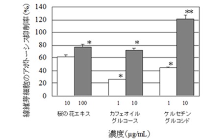 また、「糖化」は「老化」を加速させます。肥満≒糖化≒老化の方程式に、実年齢が追い越されそうです。皮膚の主要なAGEsの1つであるcarboxymethyl lysine (CML)-collagenは線維芽細胞のアポトーシス(細胞死)を引き起こしまし。つまり、皮膚の老化が促進されるのです。ところが、サクラの花エキスは下記の図のように、それを抑制してくれます。