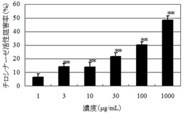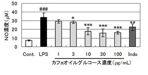 マクロファージのNO(一酸化窒素)産生量は炎症反応の重要な指標です。下図はサクラの花エキスと、その主要成分の一つカフェオイルグルコースが、NO産生をどの程度抑制するかの実験結果です。