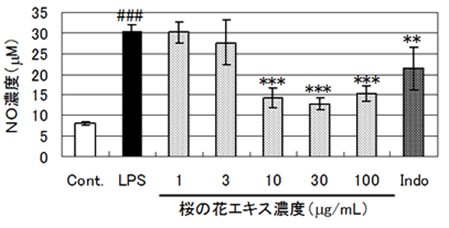 マクロファージ様RAW264.7細胞をLPS(リポポリサッカライド)によって刺激すると、NOが発生します。それをサクラの花エキス、カフェオイルグルコースは、特に30μg/mL で、非常に抑制することが示されています。(Indo :Indomethacin はインドメタシンで、非ステロイド性抗炎症薬です)。